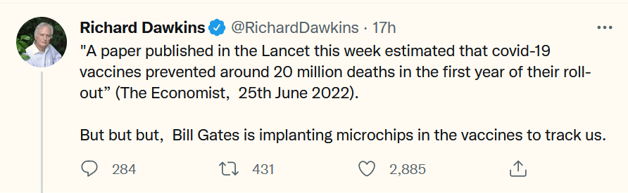 Take famous atheist Richard Dawkins. Usually a mega-sceptic (when it comes to religion anyway), he refused to acknowledge any doubt that the “experts” could be wrong about Covid; that the latest paper published by international medical journal The Lancet could be at all wrong, even though it was funded by conflict-of-interest parties the WHO and Bill Gates, and even though the study simply abandoned the metric on calculating ‘life-years lost’ (by using mathematical models that assume the same level of mortality susceptibility across all populations, whereas we all know that it was primarily the elderly who were badly affected)[ii] – and that a very large percentage of the world had already contracted Covid by the time the vaccine came out and thus had some good immunity. Where Dawkins normally belittles those with religious beliefs as being ignorant or stupid, he did a complete one-eighty and instead mocked those of us without blind faith in the “let’s vaccinate the whole planet, even though most of us don’t need it and it’s a new type of vaccine that hasn’t been fully tested” religion: